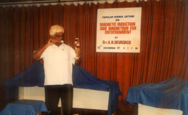 Sri Devadas started work on the programme in 1983 but used it extensively only after his retirement in 1990 he charges no money at all for the shows and presents them just for the love of it . He has presented the show to over 250 institutions in India and several countries abroad we feel that there is tremendous scope for using his technique for not only science propagation in the society but also for in depth implantation of science concepts in the mind of regular students at the school.