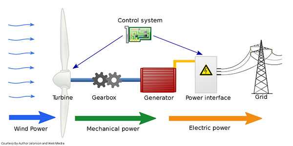 The basic concept of wind turbine is converting kinetic energy of wind into mechanical energy and then this mechanical energy into electrical energy.
